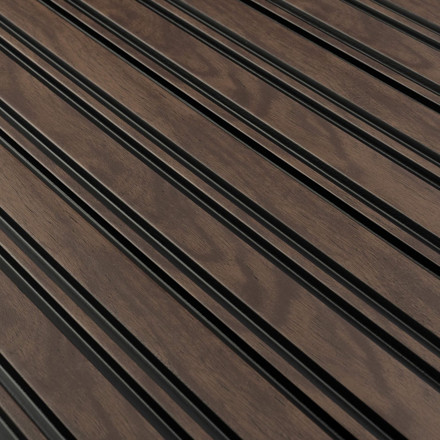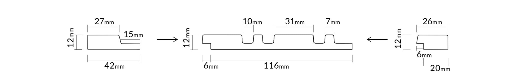 The main Milo panel has a height of 12 mm and a visible slat width of 116 mm, with clearly defined slat spacing (31 mm) and recesses (10 mm / 7 mm), ensuring precise alignment and a consistent, rhythmic appearance across the installation.